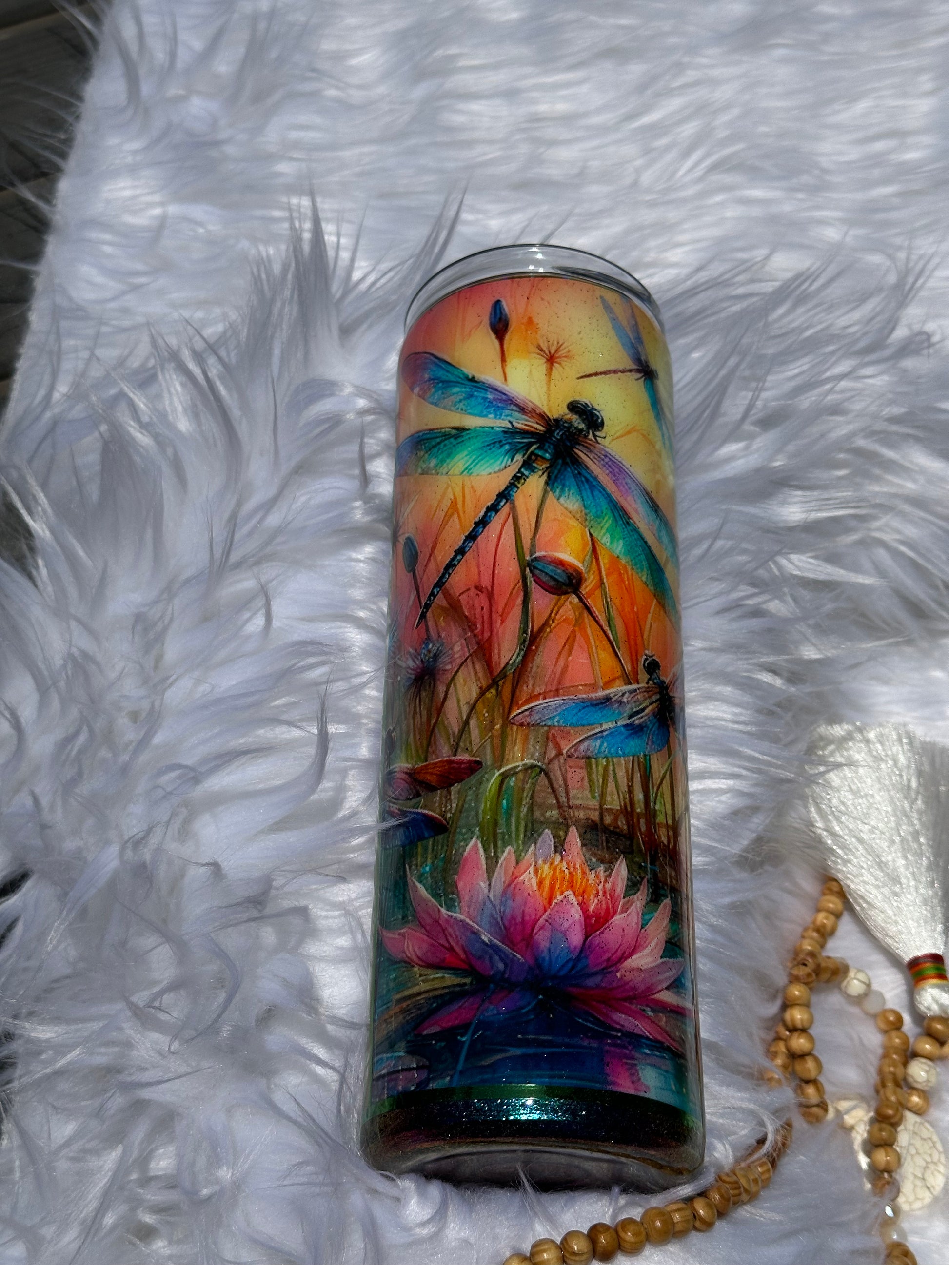 20oz stainless steel drinking tumbler with firefly vinyl and pigment powder and foil comes with lid and straw