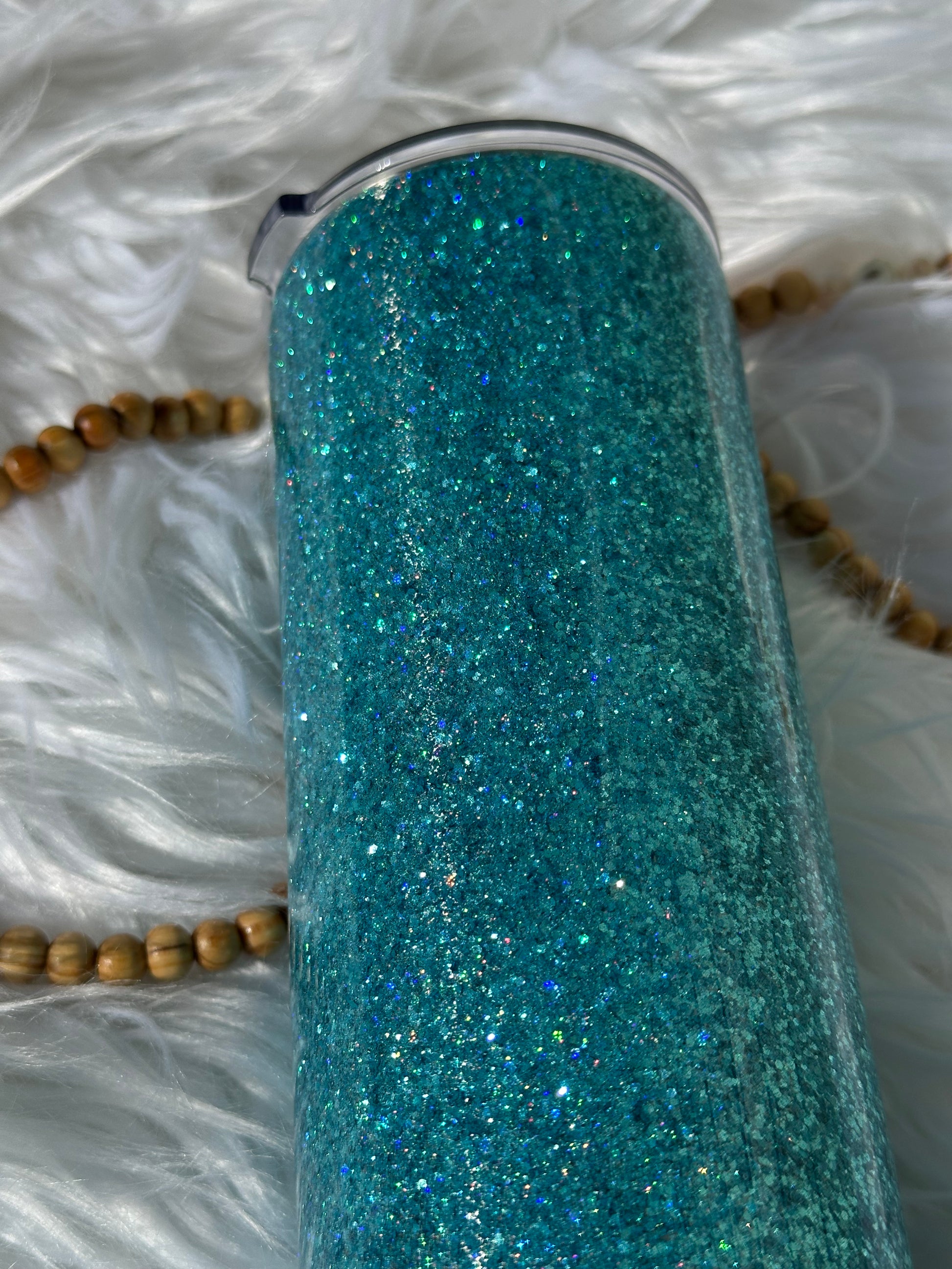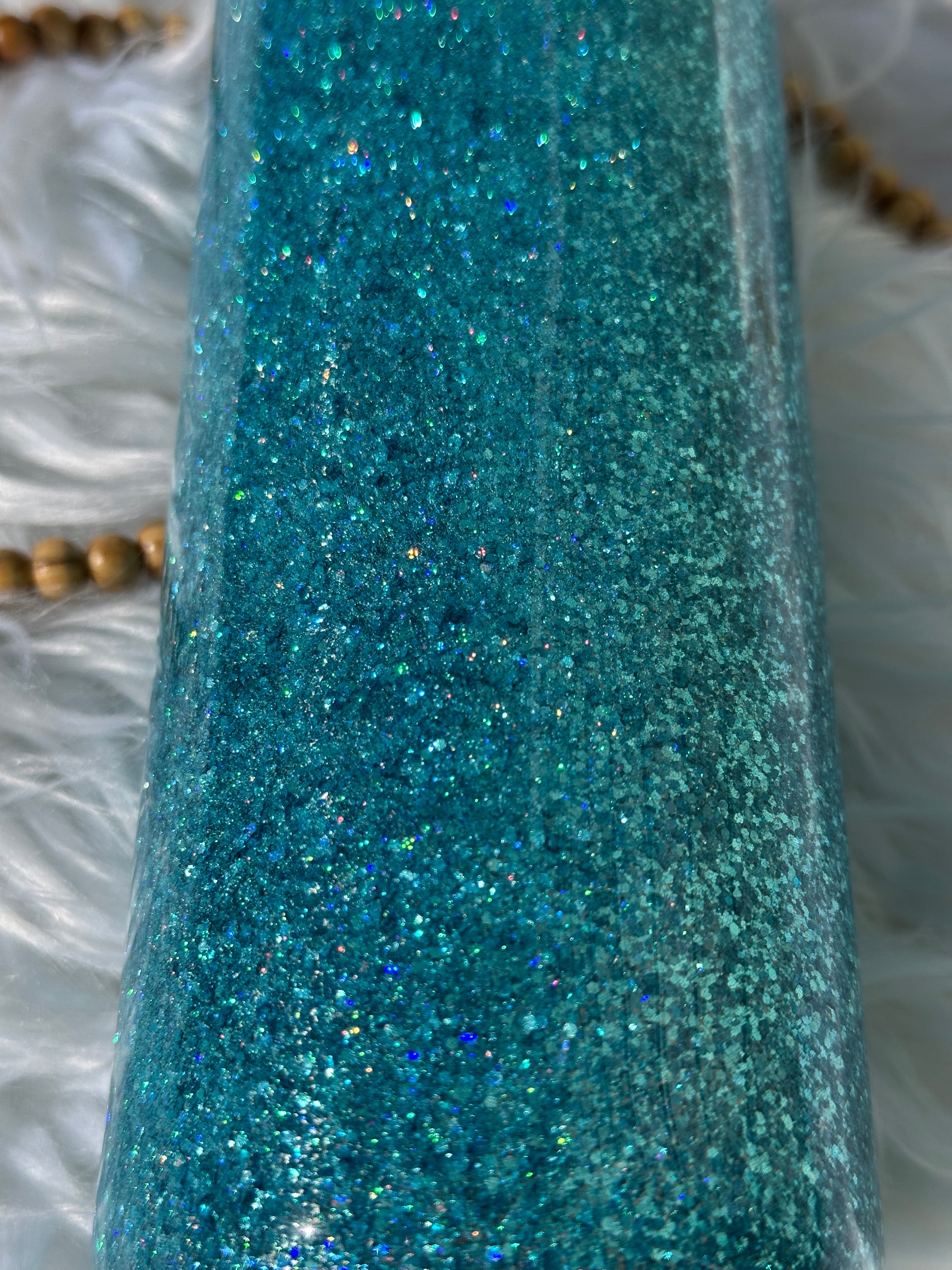 20oz turquoise glitter drinking tumbler with lid and straw with epoxy and lots of sparkle